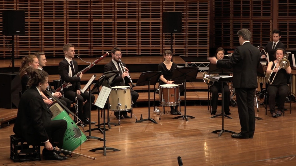 In 2016 I discussed the integration of new compositional works in the Out of the Shadows Sydney festival with the Head of Composition and Music Technology at the Sydney Conservatorium of Music, Dr Damien Ricketson. Together we put out a call for expressions of interest, and received two exciting proposals that I felt could utilise the talents of the wind and percussion instrumentalists from the SSO Fellowship. This world premiere performance of Daniel Biederman's composition The Last Renaissance Man: POW Years, 1941-1945 is conducted by Roger Benedict (the SSO Fellowship Artistic Director), with Nils Hobiger (oil-can cello, cello), Kim Falconer (flute), Joshua Oates (oboe), David McGregor (clarinet), Christopher Haycroft (bassoon), Alice Yang (horn), Jenna Smith (trumpet), Amanda Tillett (trombone), Samuel Butler (percussion) and the composer, Daniel Biederman (recorded sound, backstage behind the instrumentalists).