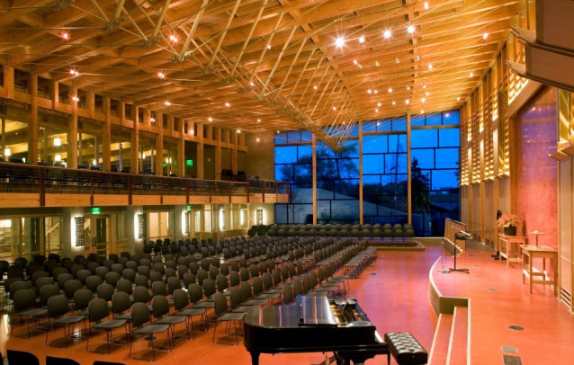 On the grounds of Frank Lloyd Wright-designed Friends Unitarian Society, a concert venue used by Performing the Jewish Archive.