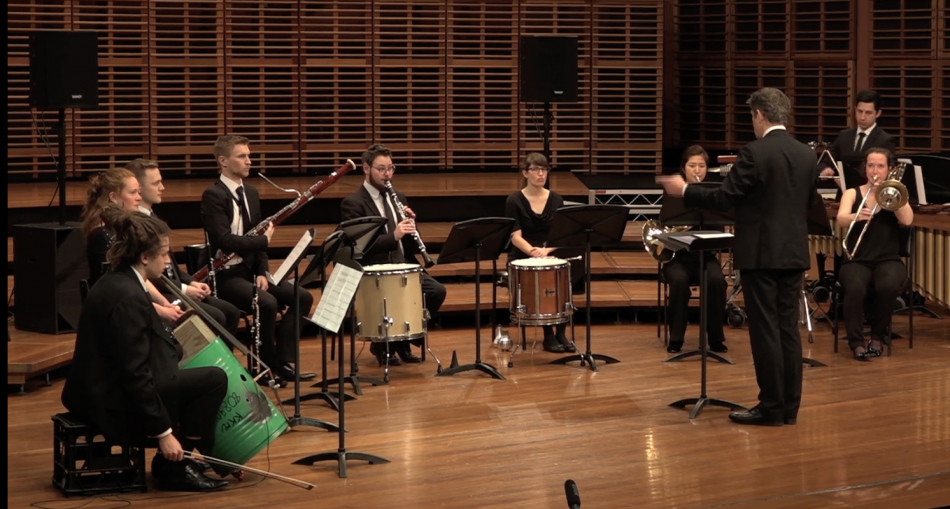 In 2016 I discussed the integration of new compositional works in the Out of the Shadows Sydney festival with the Head of Composition and Music Technology at the Sydney Conservatorium of Music, Dr Damien Ricketson. Together we put out a call for expressions of interest, and received two exciting proposals that I felt could utilise the talents of the wind and percussion instrumentalists from the SSO Fellowship. This world premiere performance of Daniel Biederman's composition The Last Renaissance Man: POW Years, 1941-1945 is conducted by Roger Benedict (the SSO Fellowship Artistic Director), with Nils Hobiger (oil-can cello, cello), Kim Falconer (flute), Joshua Oates (oboe), David McGregor (clarinet), Christopher Haycroft (bassoon), Alice Yang (horn), Jenna Smith (trumpet), Amanda Tillett (trombone), Samuel Butler (percussion) and the composer, Daniel Biederman (recorded sound, backstage behind the instrumentalists).