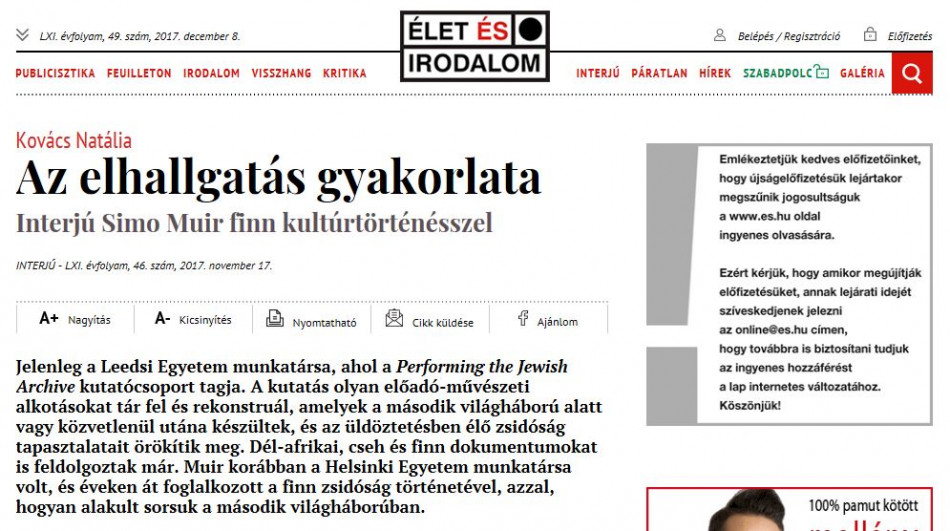 Simo Muir's interview by Natália Kovács for the Hungarian cultural magazine Élet és irodalom (Life and literature), 2017