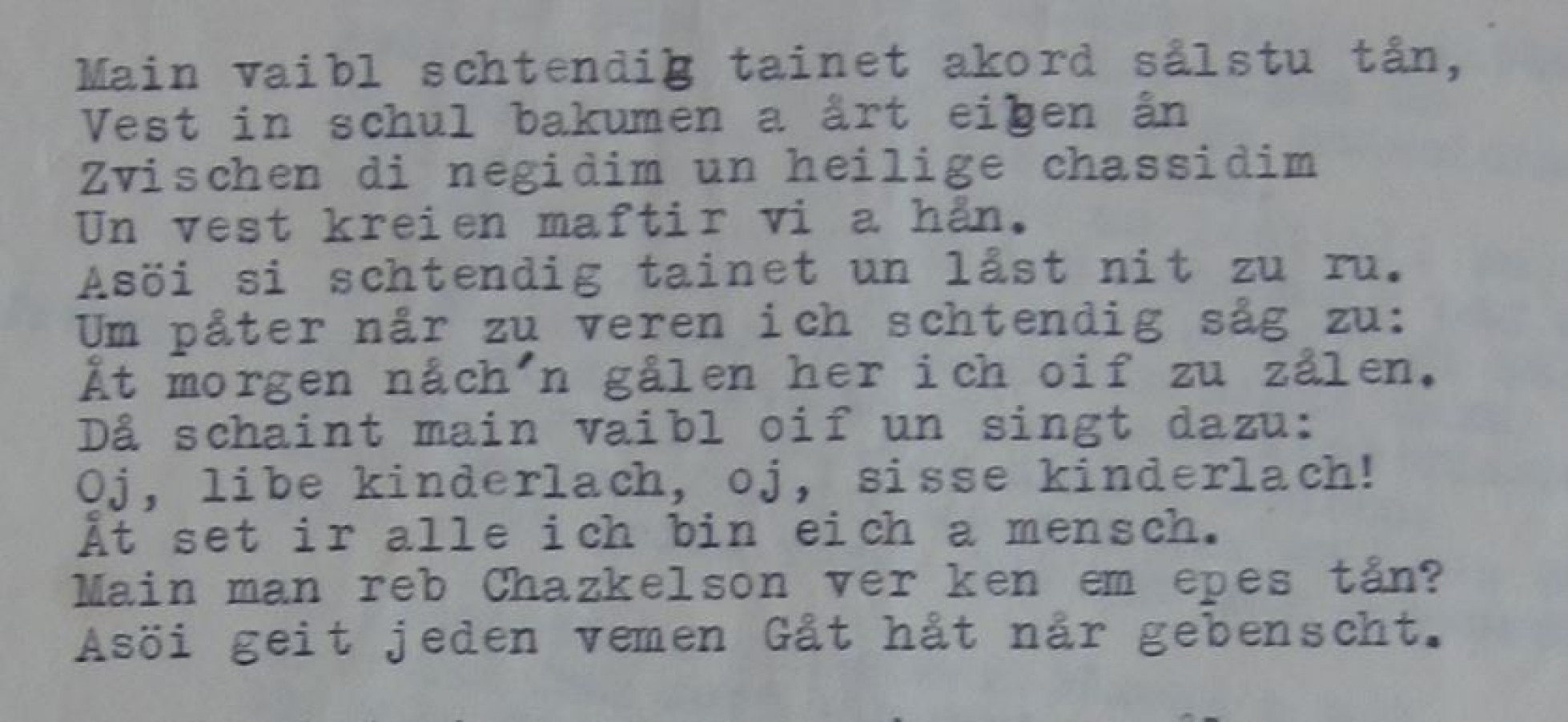 | Physical Properties | Over 100 typed pages in Latinized Yiddish. Various versions of couplets, sketches and plays. |