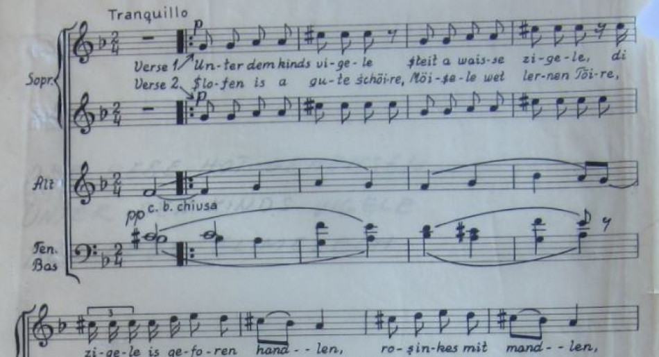 Manuscript of Simon Parmet's choral arrangement of the Yiddish folk song Under the child's cradle.