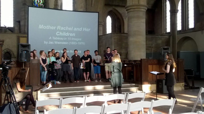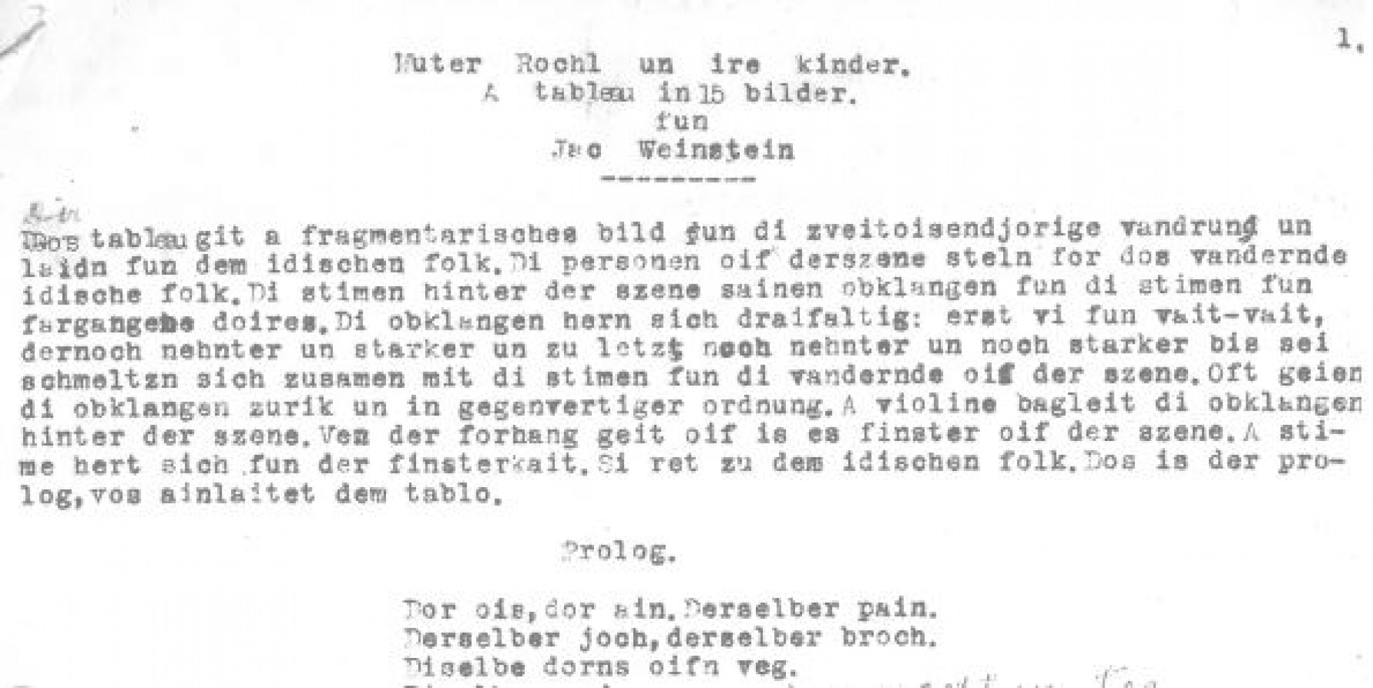 Jac Weinstein’s unpublished manuscript of Muter Rochl un ire kinder: A tableau in 15 bilder (Mother Rachel and her children: A tableau in 15 images) in Latinised Yiddish from c. 1948. The exact date of the tableau is unknown, though some of the drafts accompanying the full script include the year 1948. There are also some later amendments to the script.