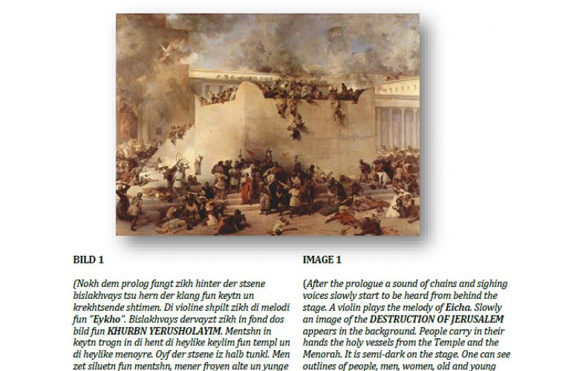 Jac Weinstein's tableau Muter Rokhl un ire kinder (Mother Rachel and Her Children) written c. 1948 depicts the two thousand year long suffering of the Jewish people culminating in the death camps of the Third Reich. The piece is centred around biblical texts from the Book of Lamentations and the Book of Jeremiah, placing the destruction of European Jewry in line with the destruction of the First and the Second Temple in Jerusalem. The tableau consists of poems and a narrative, most of which is in verse. It is recited by a ‘Voice’ whose lines are repeated and echoed by the voices of the ‘Wanderers’ and the ‘Previous generations’. They also constitute a choir that sings Jewish liturgical music in Hebrew as well as Yiddish songs that Weinstein has chosen for the tableau. The parenthesis includes descriptions about movement of the Wanderers on the stage and there are also a couple of scenes with acted roles.