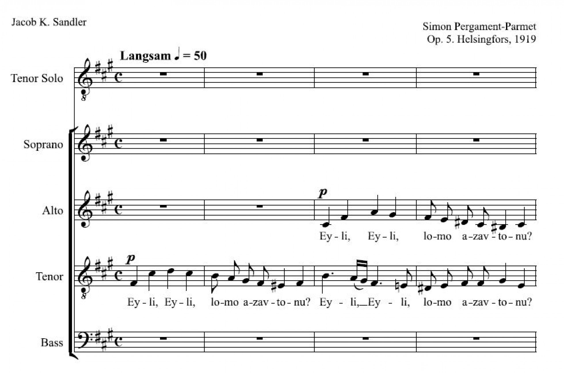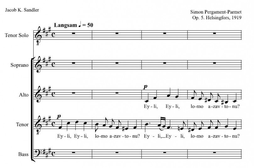 Choral piece Eyli, Eyli (My God, my God), marked as opus 5, was composed by Simon Parmet in 1919. The lyrics, which echo the words of psalm ‘My God, why have you forsaken us?’, were Parmet's adaptation of the words of Jacob Sandler's famous song with the same title.