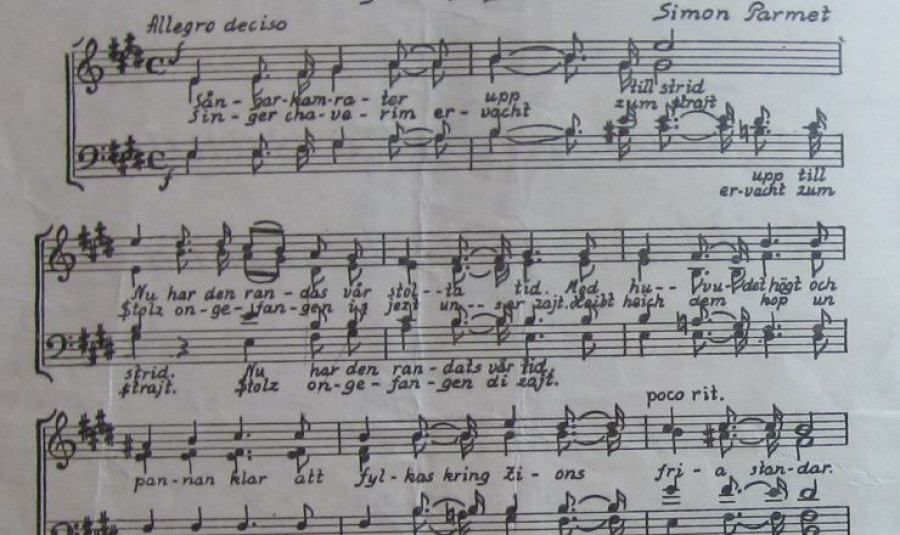 Simon Parmet composed and wrote the Swedish lyrics for Vår judiska sång (Our Jewish song) in 1930, and he dedicated the piece to the Jewish Choir Association in Helsinki. Parmet made also an orchestral arrangement for the piece. The lyrics were translated to Yiddish by his uncle Noach Oberman.